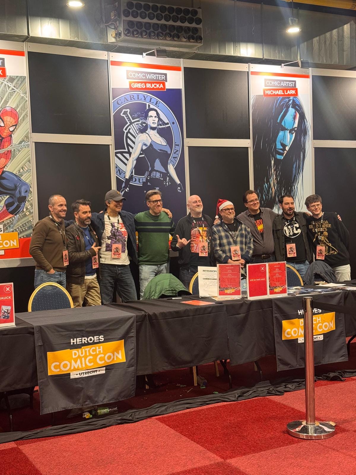 In the photo above, you can see the line up as we gathered for an end of the show group picture. From left to right: Me, Daniel Acuña, John Timms, Todd Nauck, David Macho, Michael Lark, Nick Lowe, Ben Smeares and Marc Ellerby. Greg Rucka and Danny Earls were also part of the bunch, but were not present at the moment. A great gang to hang with.